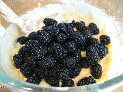I assembled my ingredients of sugar, butter, eggs, vanilla, flour, baking powder, baking soda, salt, sour cream, buttermilk, lemon zest, and blackberries.