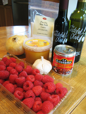 I assembled the ingredients for the raspberry chipotle sauce which will become the base for the glaze and salad dressing. The cast includes fresh raspberries, chipotles en adobo, onion, garlic, raspberry balsamic vinegar, honey, olive oil and salt to taste.