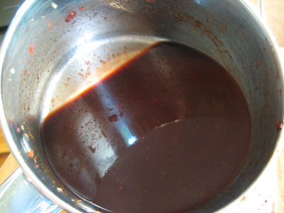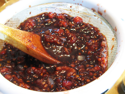 It’s thick with seeds from the raspberries and chipotles. Run the sauce through a strainer moving your spoon in a circular motion. The liquids will easily strain through leaving about 1 1/2 cups of sauce.