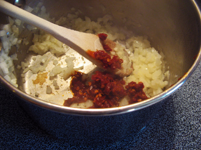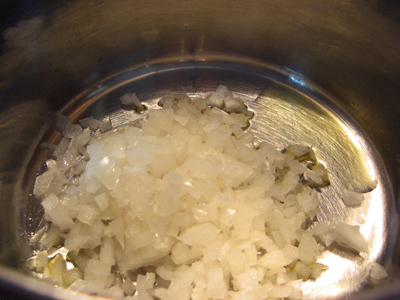 In a medium saucepan drizzle olive oil and saute approximately 1/2 cup finely diced onion.