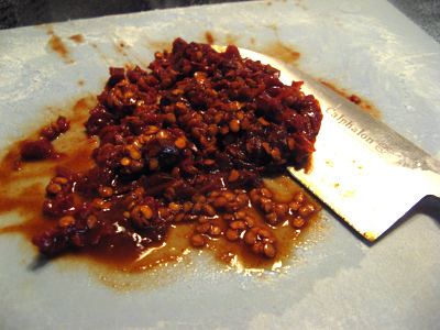 While the onion is sauteing, get a couple chipotles ready to dice.