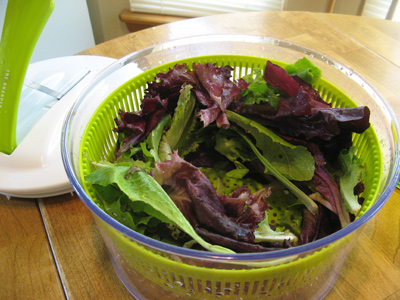My farmer’s market salad was fresh and colorful but needed a good wash and spin before going on the plate.