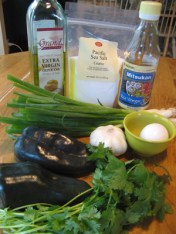 For the salad dressing you’ll need 2 poblano peppers, garlic, green onion tops, fresh cilantro, an egg yolk, olive oil, rice vinegar and salt.