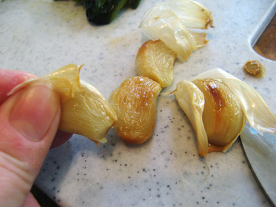 The roasted garlic will easily slide out of the outer skin.
