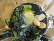Place one diced poblano pepper, the roasted garlic cloves and egg yolk into a blender.