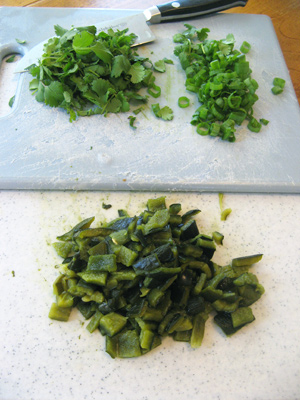 I chopped 1/4 cup of fresh cilantro and 4 green onion tops plus the poblano pepper that will go into the salad.