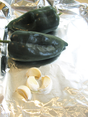I roasted the garlic and poblano peppers under the broiler at 500 degrees. The garlic will be roasted and soft after 10 minutes. Rotate the poblano’s often so that they blister on all sides about 20 minutes.