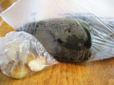 Place the garlic and poblano’s in a plastic bag to sweat it out. After about 15 minutes take the poblano’s and peel and seed them under running water.