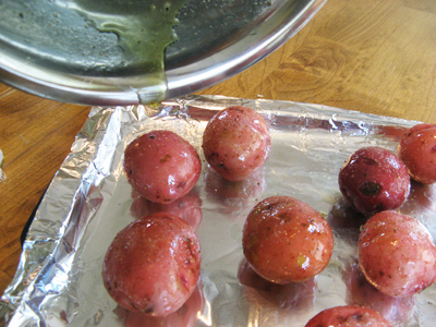 Place the potatoes on a roasting pan lined with aluminum foil. Drizzle any remaining oils from the bowl onto the potatoes.
