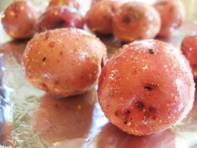 Drizzle olive oil, salt and pepper potatoes and place on a baking sheet lined with aluminum foil and bake at 375 degrees. Turn after 15 minutes and return to oven for an additional 15 minutes. Potatoes are done when fork tender. Remove to cool.