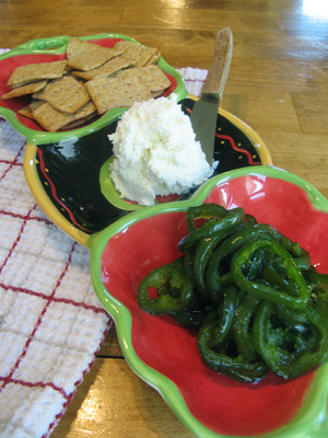 We had an appetizer platter with crackers, whipped cream cheese and freshly made candied jalapenos.