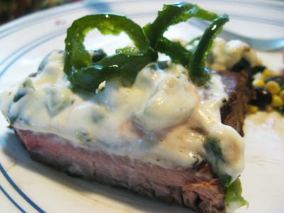 I’m not done yet. I chopped a few jalapenos to stir into the cream cheese and placed a dollop on top of my steak a couple minutes before I took it off the grill. Talk about an added layer of YUM!