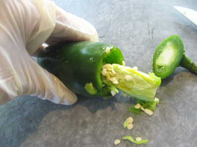 I’ve learned over the years put on a glove when working with chiles. Otherwise you could feel the burn for hours. Cut the stem off the top first.
