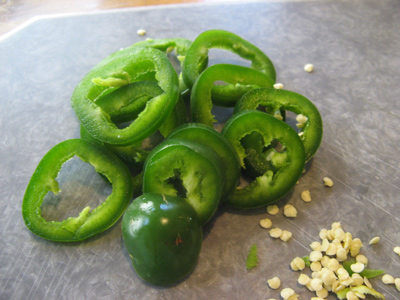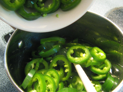 Add the sliced jalapenos and stir to coat every slice. Over the next 10 – 15 minutes they will soften and turn darker in color.