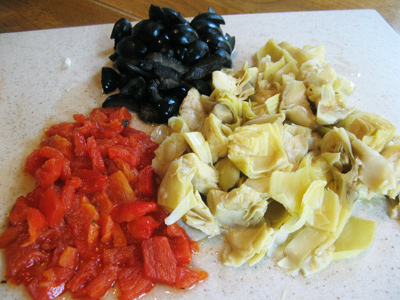 I cut the artichokes into smaller bites, diced the roasted red pepper and 1/2 of the can of olives.