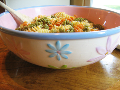I poured the pasta into my new bowl. I got it at the thrift shop for .99 cents and thought it was cute. All my guys give me grief over it though, they think it’s girly! Well, I happen to like it.