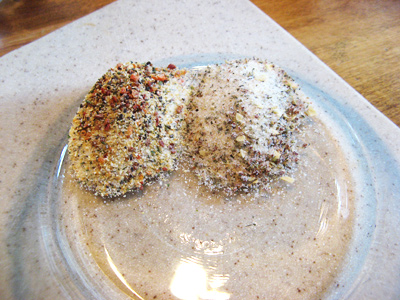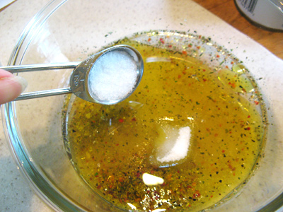 Next step is to make the salad dressing. If you can’t get the Penzey’s Italian dressing mix, Good Seasons will do. (FYI, Good Seasons Italian Dressing packet measures about 2 tablespoons so you could just use the entire package instead). I put a tablespoon of each into a medium sized bowl.