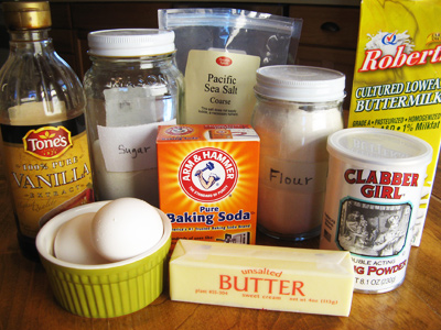 The cake ingredients are butter, flour, baking powder, baking soda, salt, sugar, eggs, vanilla, and buttermilk.