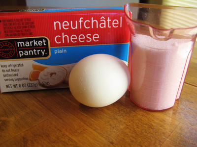 Time to make the cream cheese filling. It includes a package of Neufchatel cheese (cream cheese), 1 egg and 1/4 cup sugar.