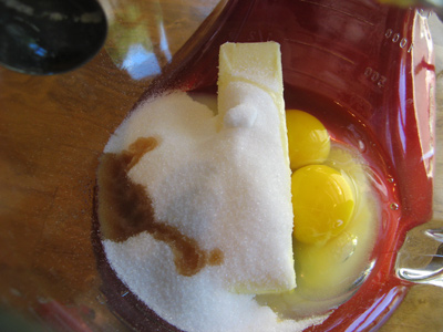 Get started first with the cake batter. In a mixing bowl cream together 1 stick of softened butter, 2 eggs, 3/4 cup sugar and 1 teaspoon vanilla.