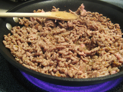 When ready, heat up a skillet over medium high heat and add your ground pork.  Traditionally you would use ground lamb which I would have loved to try if only I could have found it.