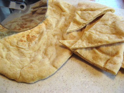 Next, cut up 1 flat bread per person into 8 triangles.  Lay them on a baking sheet and place into a 425 degree oven for 7 – 8 minutes to toast.
