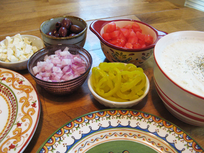Get ready with the toppings . . . the tzatziki sauce, feta cheese, kalamata olives, pepperocini slices, diced onion and tomato.