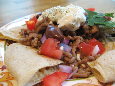 Arrange pita chips or toasted flat breads on a plate and top with seasoned browned pork or lamb, diced tomatoes, diced onions, feta cheese, kalamata olives, pepperocini slices and tzatziki sauce.