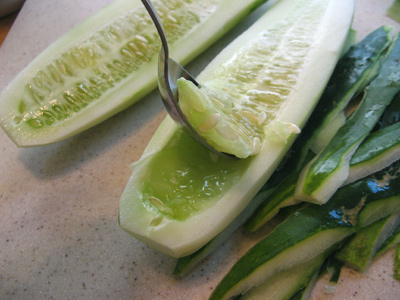 Prepare the cucumbers by peeling first, then scoop the seeds out.