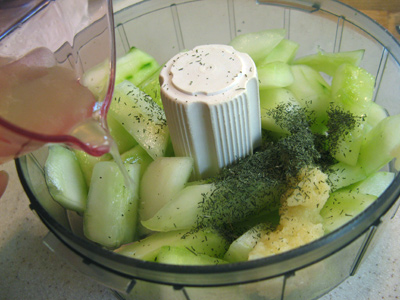 Drain cucumbers and pat dry with a paper towel.  Combine the cucumbers, garlic, dry dill and lemon juice in a food processor.