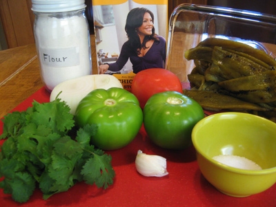 For the sauce you’ll need about 12 roasted green chile, onion, garlic, tomato, cilantro, flour, chicken stock and tomatillos. The tomatillo’s are optional. Traditional NM green chile sauce doesn’t include tomatillos but I was in the mood for the tartness and tang that tomatillos are known for.