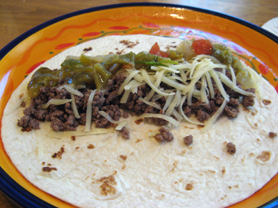 I forgot to take pics of the tortillas, but these are the 8 inch flour tortillas. Start filling your tortilla with about 3 big spoonfuls of ground beef, top with cheese.