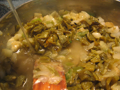 Then add the chopped green chile and chicken stock. I added approximately 1 1/2 cups of stock. The sauce will start to thicken and if too thick, add more stock. You can’t go wrong.