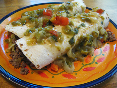 Brown ground beef in a skillet over medium high heat. Drain any excess oils and salt to taste. Fill flour tortillas with ground beef, shredded cheese and sauce. Roll up. Pour additional green chile sauce and cheese over the burritos and heat in oven to melt cheese.