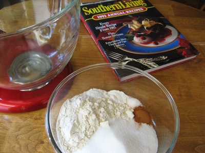 Combine dry ingredients of flour, sugar, baking powder, baking soda, salt and cinnamon.