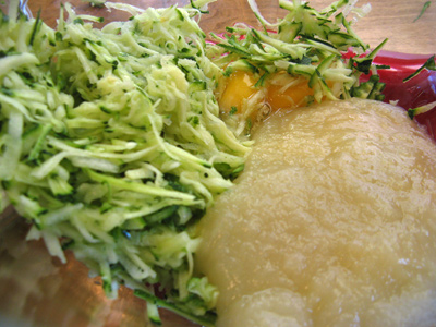 In a mixing bowl, combine 2 eggs, 2/3 cup of unsweetened applesauce and 2 cups grated zucchini.