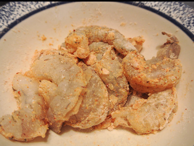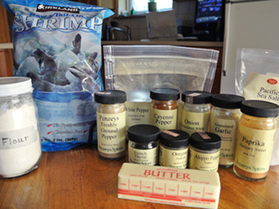 This seasoned flour is going to taste great as a coating for the shrimp.