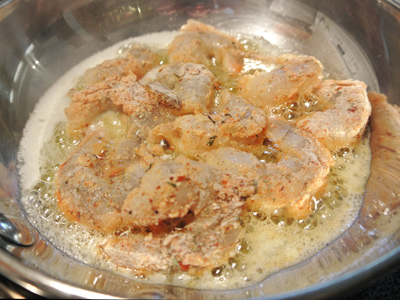 I changed up the seasoning a bit from Chef Paul’s original recipe.  I seasoned the shrimp with salt, black pepper, white pepper, cayenne pepper, onion powder, garlic powder, paprika, thyme, oregano, Aleppo pepper and flour.  The butter is for pan frying.