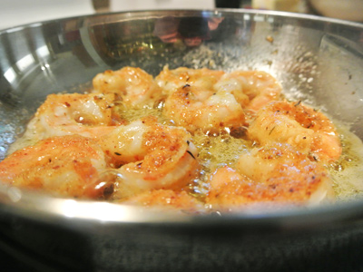 I heated a small skillet to medium high with 1 1/2 tablespoons of butter, then added the shrimp to the pan.  In just a minute or two the shrimp start to turn pink.  At that point time to turn them over for another minute or two.