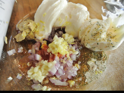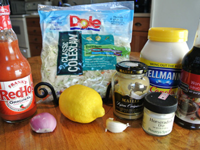 You’ll need some slaw or shredded cabage, mayonnaise, dijon mustard, worcestershire sauce, lemon juice, lemon zest, garlic, shallots, horseradish (or in my case dried horseradish dip), and some hot pepper sauce.
