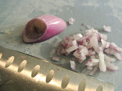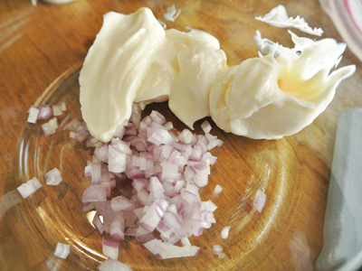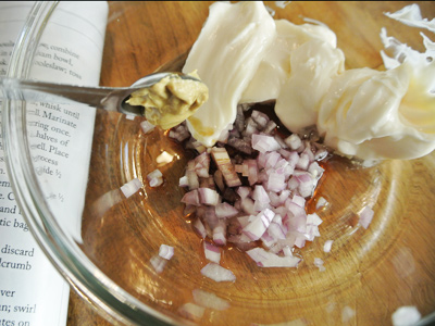 In a medium bowl start to combine shallot and 3 tablespoons mayonnaise.