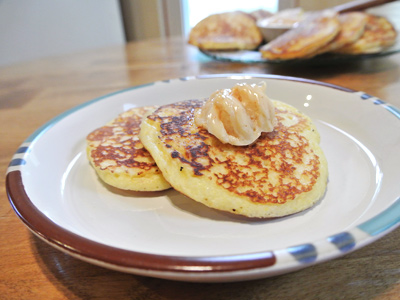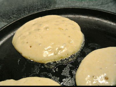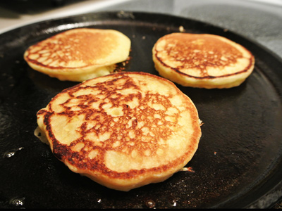 Butter a cast iron griddle or skillet over medium high heat. Pour 1/4 cup batter onto hot griddle. Cook 2 – 3 minutes on each side. Transfer to a warming plate while you cook these in batches.