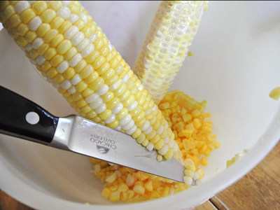 Cut the corn from the cob. It’s easier to use a deep bowl to catch all the flying kernels.