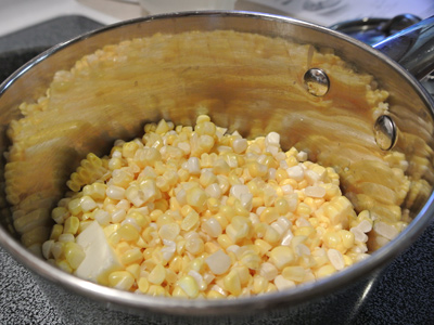 Cut corn kernels from cob and place in a medium saucepan over medium heat with a tablespoon of butter. Stir while the butter melts in the pan. Cook for 2 minutes, turn off the heat, cover and let sit over hot burner for 5 minutes.