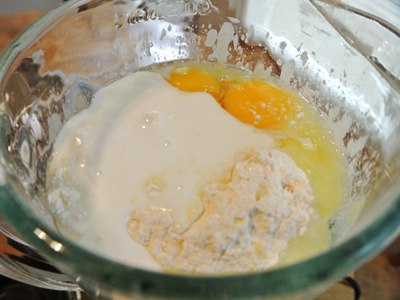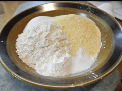 While the corn is steaming, time to mix the dry ingredients. You’ll need 1 3/4 cups flour, 3/4 cup cornmeal, 2 tablespoons sugar, 1 tablespoon baking powder, 1 teaspoon salt. Mix it all together.