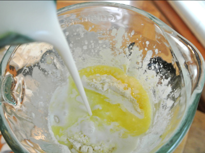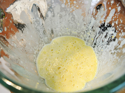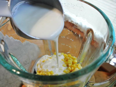 Puree the corn and milk. I used to mix up the remaining batter by hand, but I’ve since decided that it’s just as easy to mix everything in the blender. You just need to scrape the sides to get it flowing.