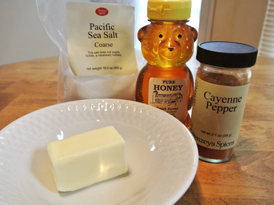 Whisk together softened butter, cayenne pepper and honey together in a small bowl. Add a pinch of salt if using unsalted butter. Note** Once butter has been refrigerated it will become hard. Set at room temperature a few minutes before serving.