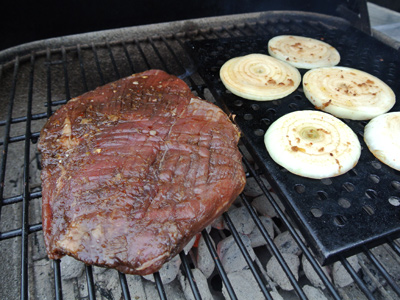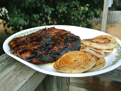 In order to time this out I’m going to cook the onions with the steak first. I placed them on a hot grill plate which works great for the slices. Place the steak over the hot coals and cover for 7 minutes.