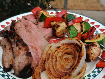 Heat charcoal in a grill. Place onion slices on a grilling plate and grill on one side and the flank steak on the other. The onions should cook 3 1/2 minutes on each side. When the onions are done at 7 minutes, turn the steak to cook an additional 6 minutes on the other side for medium rare. Place the veggie kabobs on the grill and cook 10 – 12 minutes turning every few minutes to avoid charring.