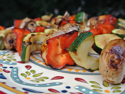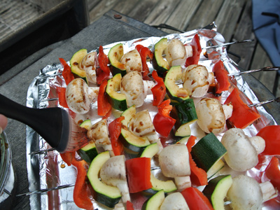 Brush some of the marinade over the veggies, turn skewer to brush over all sides.